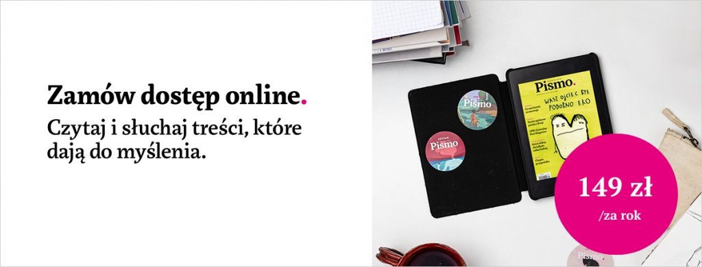 Dostęp online, który aktywujemy od razu po zaksięgowaniu płatności, pozwoli Ci czytać i słuchać „Pisma”, gdzie i kiedy chcesz. Na komórce, tablecie, komputerze i czytniku. W serwisie znajdziesz wszystkie treści z aktualnego numeru, pełne cyfrowe archiwum oraz treści dostępne tylko online. W serwisie nie ma reklam. Świadomie zrezygnowaliśmy z modelu finansowania opartego na przychodach reklamowych.