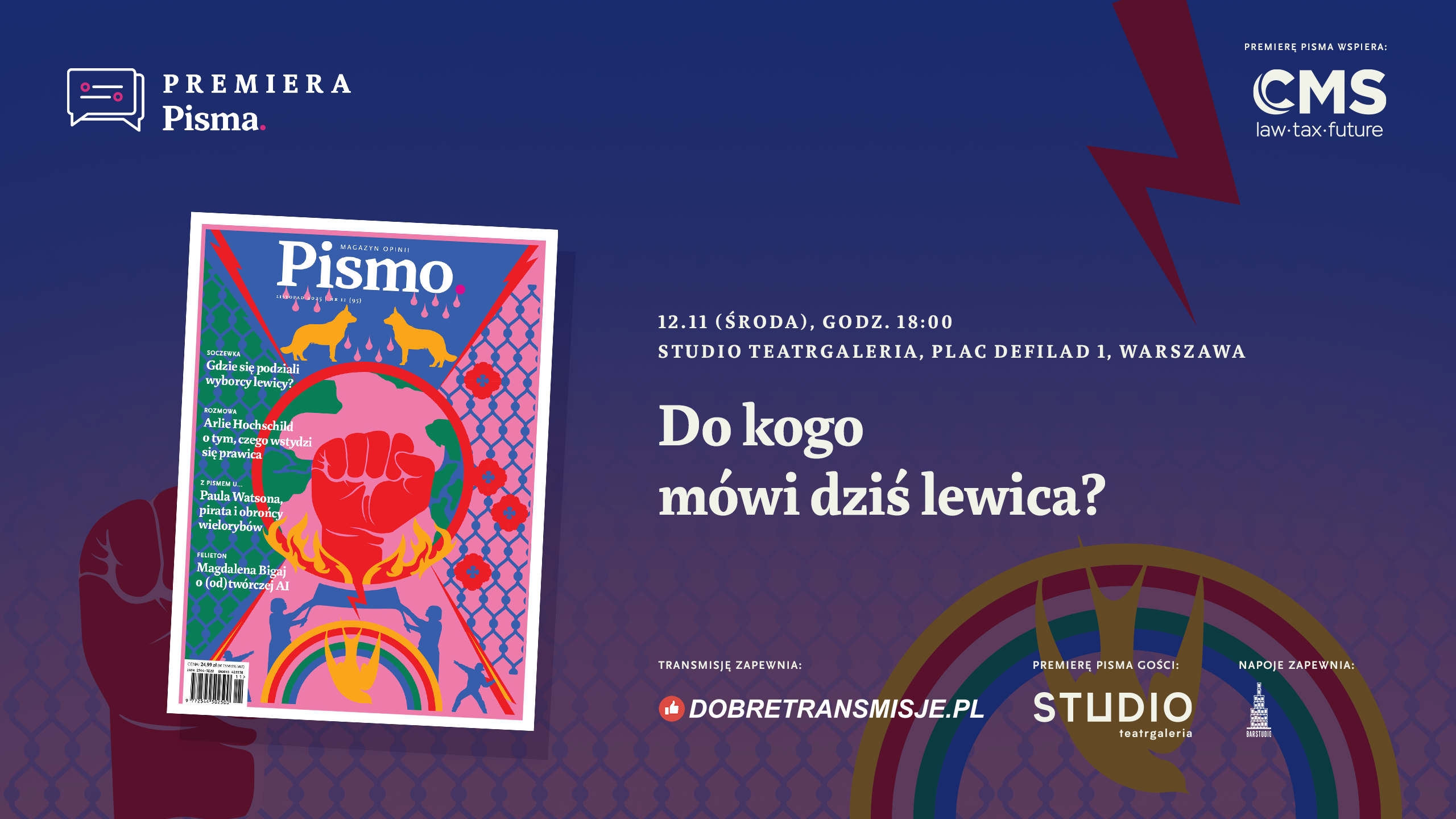 03 grudnia o godzinie 18:00 udostępnimy transmisję wideo z wydarzenia na profilach „Pisma” na YouTube, Facebooku i LinkedInie, a także na stronie magazynpismo.pl. Będzie ona dostępna TUTAJ.