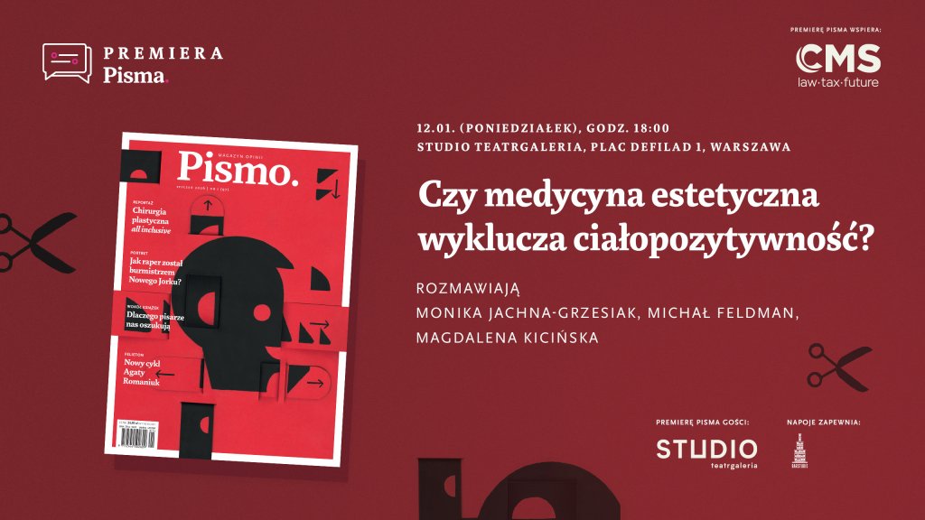 Jak pokazuje raport Polska za filtrem 2025, ponad jedna trzecia Polek i Polaków myślała w ciągu ostatnich pięciu lat o zabiegu z dziedziny medycyny estetycznej – i jest to przejaw wciąż zauważalnego wzrostu zainteresowania poprawą swojego wyglądu. Jak ta sytuacja ma się do równolegle nasilającego się trendu ciałopozytywności? Gdzie jesteśmy w dyskusji o tym, czy medycyna estetyczna to dowód na opresję patriarchatu, czy też wyraz wolności wyboru? Jak na postrzeganie naszego ciała wpływają nowoczesne media? I czy możliwe jest pogodzenie akceptacji swojego wizerunku z chęcią dokonywania operacji plastycznych? O tym porozmawiamy podczas styczniowej Premiery Pisma.