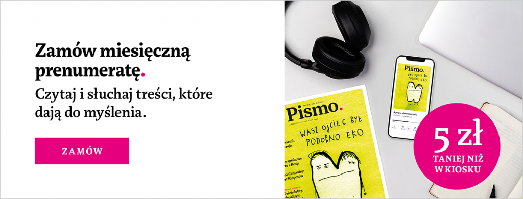 Prenumerując „Pismo”, pomagasz rozwijać magazyn, tworzyć ponadczasowe, najwyższej jakości, sprawdzone treści, które nam wszystkim pozwalają lepiej zrozumieć świat i naszą w nim rolę.